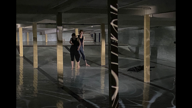 The audience does not enter the auditorium in a traditional way, but it is led through a secret passage behind and under the stage on a route with installations, in which dancers and musicians are engaged. After arriving on stage, the public is proceeding over the orchestra pit to their seats. Only then, the actual dance performance starts.